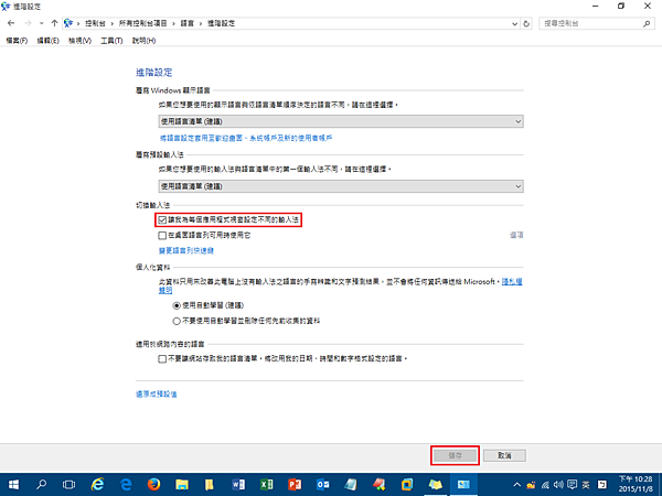 然後勾選「讓我為每個應用程式視窗設定不同的輸入法」,再按【儲存】。