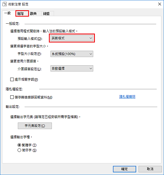 首先,將「預設輸入模式」設為【英數模式】,然後切換到「進階」頁籤。