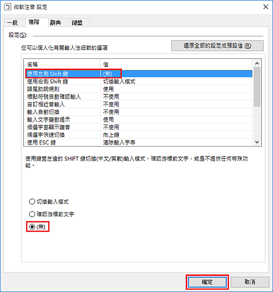 05. 在下圖的清單裡點選「使用左側 Shift 鍵」,然後再點選下方的【(無)】,最後按【確定】,