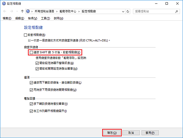 07. 出現下圖畫面後,取消勾選「連按 SHIFT 鍵 5 次後,啟動相黏鍵」,並按【確定】後,