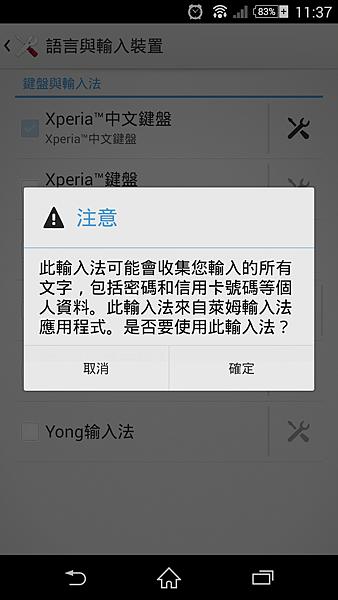 (幾乎所有非系統自帶的輸入法 APP 被勾選時都會出現此警告)