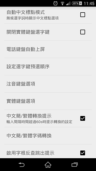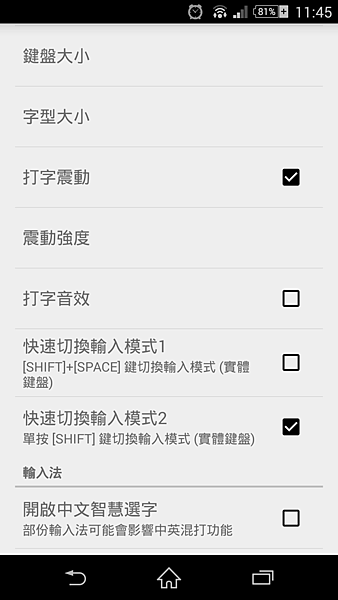 可以設定按鍵時是否振動、簡繁轉換、反查字根…總共有將近 6 頁的設定選項。