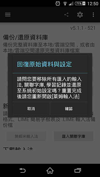 可以開啟「萊姆輸入法」,點選畫面右上方的直向「...」圖示,然後選【回復原始設定】。