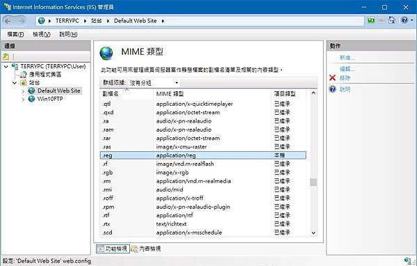 如果伺服器管理者開啟 IIS 設定畫面,就會看到 IIS 自動新增了一個 reg 的項目,